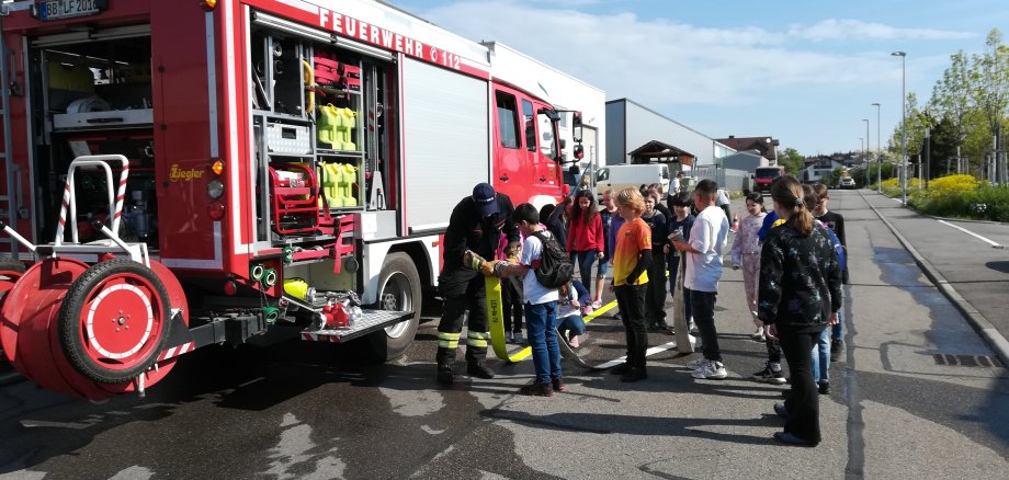Am Montag, den 15.05.2023 ging die Klasse 4a zur Freiwilligen Feuerwehr in Malmsheim (Renningen). Um 8:40 Uhr sind sie losgelaufen. Nach ca. 15 Minuten kamen sie dort an. Herr Bellon hat sie freundlich begrüßt. Die Klasse ist ins Feuerwehrhaus gelaufen und die Kinder haben ihre Jacken und Rucksäcke abgelegt, damit sie nichts in der Hand tragen mussten. Danach haben sie sich in einem Halbkreis aufgestellt und Herr Bellon hat ihnen erklärt wie ein Feuer brennen kann. Er hat den Kindern ein Modell in der Form eines Dreiecks gezeigt, wo sie sehen konnten, was ein Feuer braucht, um zu brennen. In der Mitte des Modells war ein Bild eines Feuers zu sehen. Der Feuerwehrmann klappte einen Teil ein den ein Feuer zum brennen braucht und das Dreieck fiel zusammen. Auch als er den anderen Stoff einklappte, fiel das Dreieck zusammen. Insgesamt gibt es drei Stoffe und zwar Wärme, Sauerstoff und Brennstoff. Ein paar Fragen wurden den Kindern noch gestellt und die Kinder stellten auch noch viele Fragen zur Feuerwehr und zum Feuer. Als sie fertig waren, bat Herr Kapp die 4a ihm in die Umkleide zu folgen. Herr Kapp zeigte ihnen wie man einen Feuerwehranzug anzieht. Er erklärte, dass man die Kleider nicht auszieht die man anhat, sondern den Feuerwehranzug einfach darüber zieht, da es, wenn es brennt schnell gehen muss. Herr Kapp sagte, dass man die Schuhe aber ausziehen sollte. Er zog sich sogar um, um den Kindern zu zeigen wie man sich umzieht und was ein Feuerwehrmann oder eine Feuerwehrfrau alles an Ausrüstung braucht. Der Feuerwehrmann Herr Kapp wollte von den Kindern wissen in welcher Reihenfolge er die Sachen anziehen soll. Diese Aufgabe war für die Kinder nicht besonders schwer. Doch am Ende der Aufgabe übersahen sie, dass der Lappen der hinten am Helm befestigt war, nach oben geklappt war. Nach ein bisschen Zeit hatten das die Kinder der Klasse 4a aber auch bemerkt. Den Kindern wurde erklärt, dass es zwei Eingänge die jeweils außen sind, gibt und zwei Ausgänge in der Mitte, damit niemand mit jemand anderem zusammenstößt. Anschließend liefen alle aus der Umkleide und stellten sich wieder in einem Halbkreis auf. Nun zeigte ihnen der Feuerwehrmann Herr Kapp wie man eine Luftflasche aufsetzt. Ein Kind fragte wie viel so eine Jacke und ein Schuh wiegen. Daraufhin meinte Herr Kapp, ein Anzug wiegt 2 kg und die Schuhe wiegen 4 kg. Die Sachen wurden herumgereicht und der Schuh war deutlich schwerer als die Jacke. Herr Kapp setzte außerdem eine Atemschutzmaske auf und sagte den Kindern, dass er mit der Maske 15-30 Minuten atmen konnte. Schließlich rannten alle Kinder der 4a schnell raus. Dort mussten sie zunächst den Gully für den Hydranten finden und ihn aufmachen. Die Feuerwehrleute bauten alles auf und die Klasse schloss die Schläuche an. Die Feuerwehr teilte sie danach auf 2 Stationen auf. An der einen konnte man Werkzeuge ausprobieren, die sie bei Autounfällen benutzen und man durfte in das Feuerwehrauto einsteigen und an der anderen durften die Kinder mit dem Schlauch spritzen. Alle hatten viel Spaß. Dann war der Feuerwehrbesuch auch schon zu Ende. Eine Viertelstunde später waren sie wieder in der Schule und alle sprachen darüber, wie toll es war.